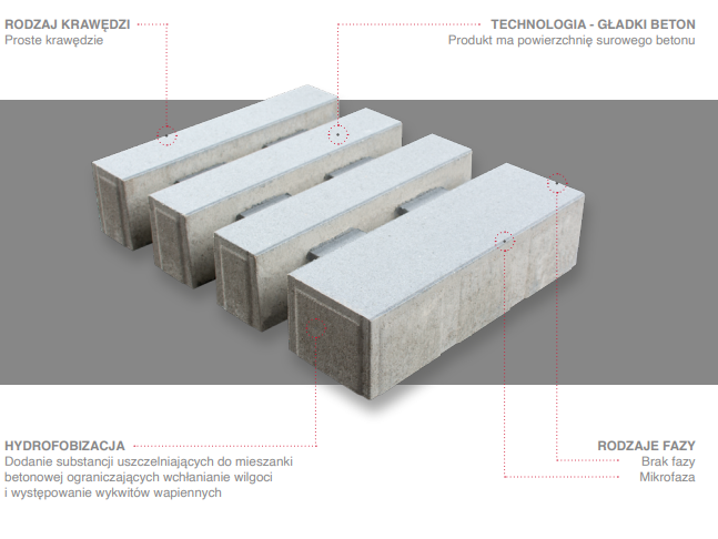 Pojedynczy format o prostych krawędziach i gładkiej powierzchni surowego betonu. Produkt posiada subtelną mikrofazę na dłuższych krawędziach, zaś krótsze krawędzie są jej pozbawione. Dzięki temu podkreślony jest efekt nawierzchni zbudowanej z podłużnych formatów.
