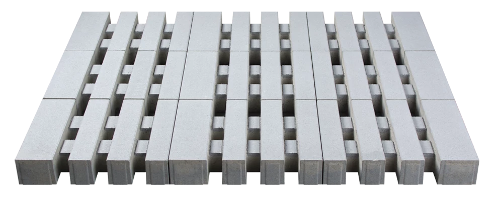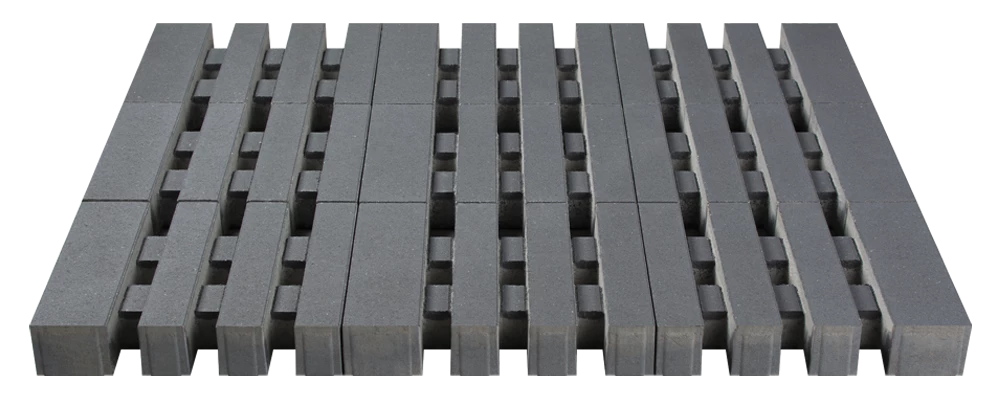Przestrzenie możliwe do wypełnienia trawą lub grysem tworzą podłużne pasy nadając całej powierzchni nowoczesny charakter. Produkt posiada powierzchnią biologicznie czynną i sprawdzi się wszędzie tam, gdzie potrzebne jest dodatkowe, szybkie odprowadzenie wód opadowych.